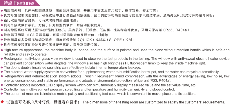 恒溫恒濕試驗機又名環境試驗機,試驗各種材料耐熱、耐寒、耐干、耐濕性能。適合電子、電器、通訊、儀表、車輛、塑膠制品、金屬、食品、化學、建材、醫療、航天等制品檢測質量之用。Climate Chamber is also called environment testing machine, used to test various types of materials for their tolerances of heat, cold, dry, humidity.Application: Quality inspection for all types of electronic products, electric appliance, and products from communication, instrument, automobile, plastic, metal, food, chemical, building materials, medical and aerospace industries.