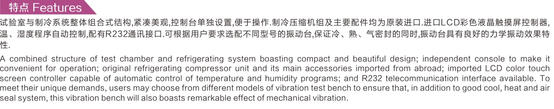 與恰當的振動試驗臺相配合,滿足各種相應的溫度、濕度、振動三綜合試驗要求。該產品在航空、航天、船舶、電子、通訊等領域有廣泛的用途。Used with appropriate vibration test bench to meet respective integrated environmental test requirements of temperature, humidity and vibration; extensively applied in many a field including aviation and aerospace, shipping, electronics and telecommunications.