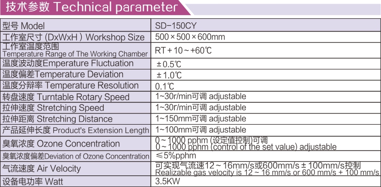 臭氧在大氣中的含量很少卻是橡膠龜裂的主要因素,臭氧老化箱模擬和強化大氣中的臭氧條件,研究臭氧對橡膠的作用規律,快速鑒定和評價橡膠抗臭氧老化性能與抗臭氧劑防護效能的方法,進而采取有效的防老化措施.以提高橡膠制品的使用壽命The ozone is few in the content in the atmosphere but is the main factor that the rubber crack,the aging box of ozone imitates and enhances the ozone in the atmosphere condition,studying thee ozone to the function regulation of the rubber,authenticate and evaluate the rubber anti-ozone method of the aging function and a protection of the antiozone effect quickly,then adopt to defend the aging measure effectively,with the service life that the exaltation rubber product.